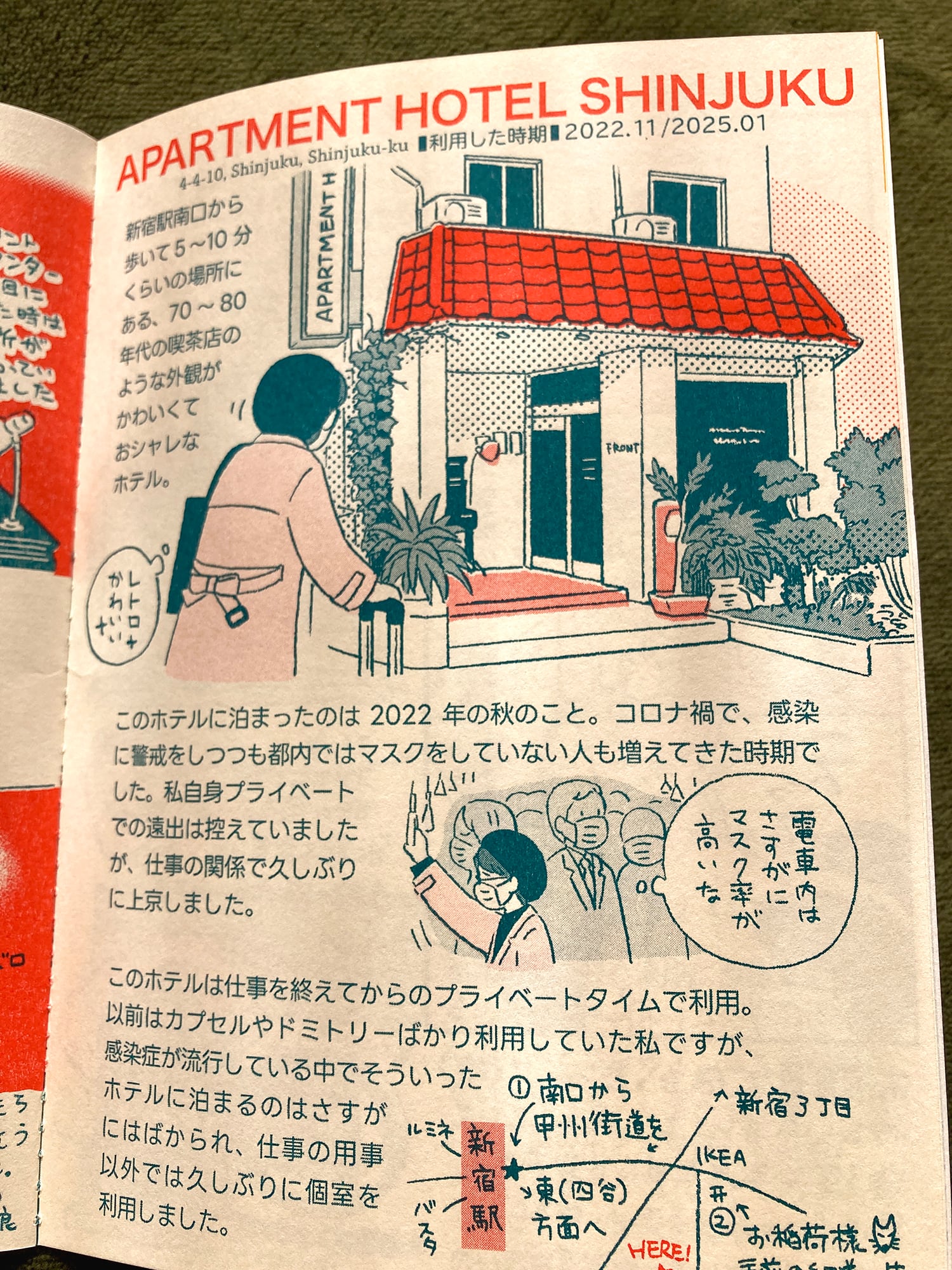 「宿泊」をテーマに、過去に泊まったホテルや、そこでの思い出を描いたイラストエッセイです。新宿・代々木八幡のホテルを紹介しています。